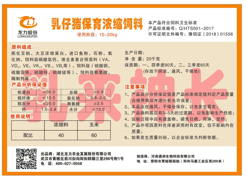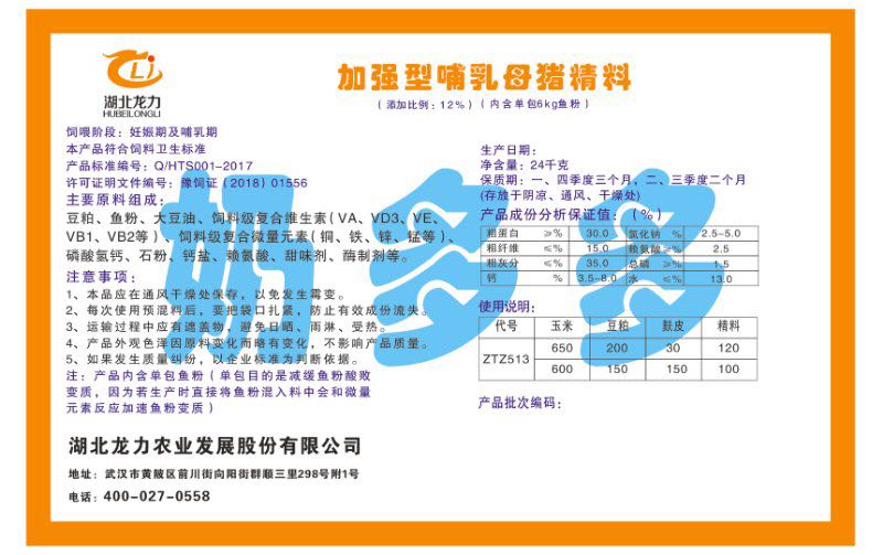 湖北龍力農業發(fā)展股份有限公司坐落于武漢市黃陂區前川街向陽街群順三里298號附1號。公司成立于2014年6月,公司自成立以來把“創(chuàng)全球最大養豬綜合服務”為企業愿景。致力于打造教保料品牌”作為公司發(fā)展的明確目標。公司一直致力于豬營養的研究和開發(fā),積極與國內外高校和科研機構合作,推廣養豬技術、動物營養新概念,向世界農牧企業學習與合作。公司采用國內先進的生產工藝,選擇高精度電子配料秤,高均勻度、無殘留混合機等先進設備....